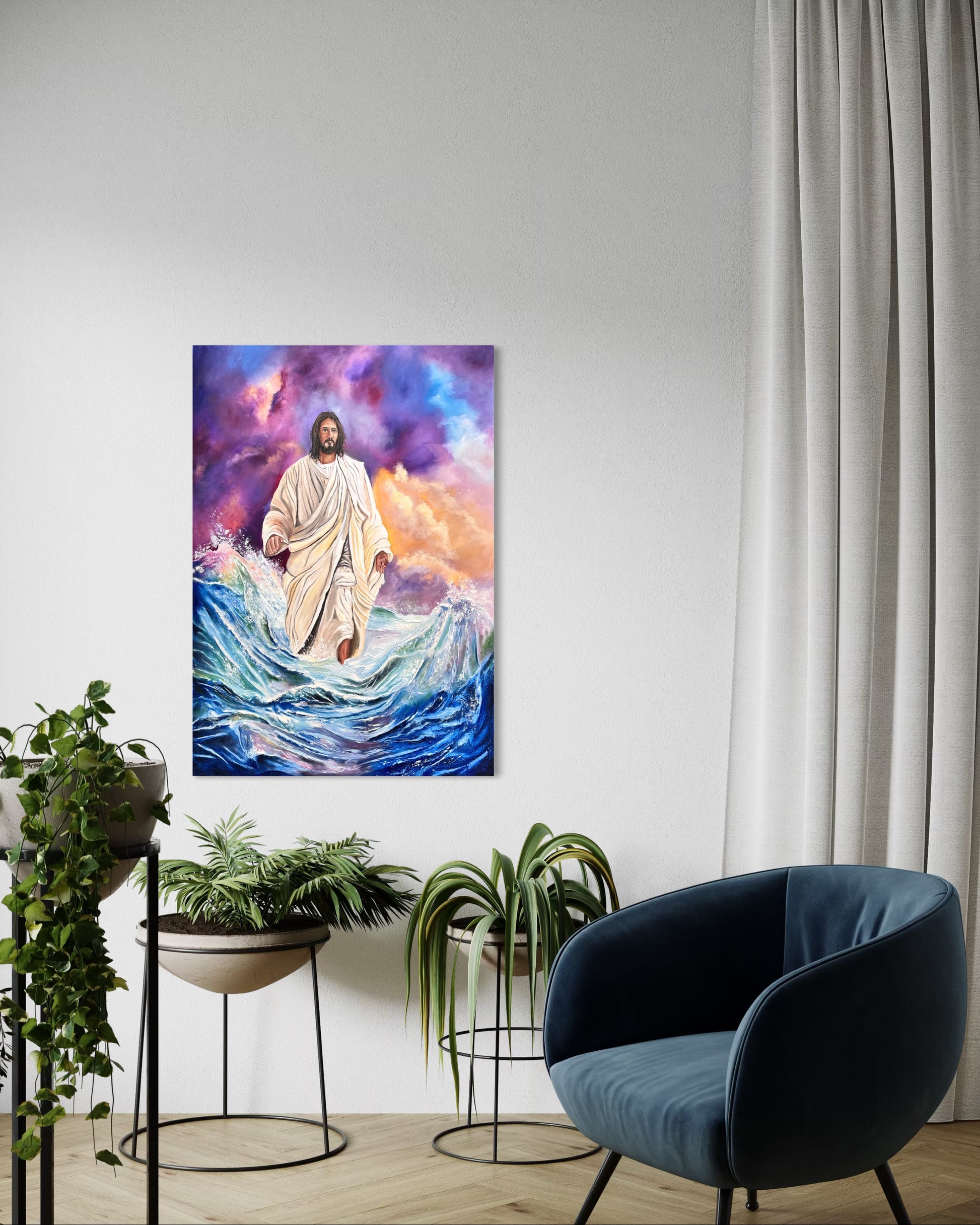 The composition portrays a singular figure moving with quiet confidence across a restless sea, the unfurling waves rendered with rich texture that amplifies the sense of depth and motion. Draped in flowing white robes, the figure stands as a beacon of steadiness amid the tumult, their serene expression conveying unwavering focus and inner strength. A vibrant sky—alive with energetic hues of purple, blue, and orange—stretches overhead, framing the scene with a dynamic yet harmonious interplay of color and light that suggests both challenge and hope.