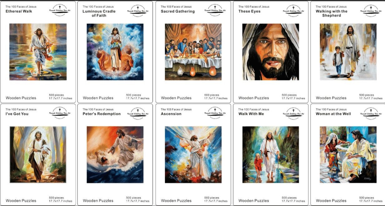 500 pieces featuring The Woman at the Well, measuring 17.7 x 17.7 inches when assembled. Each piece is a unique shape and an image in itself for an adventure in assembly.