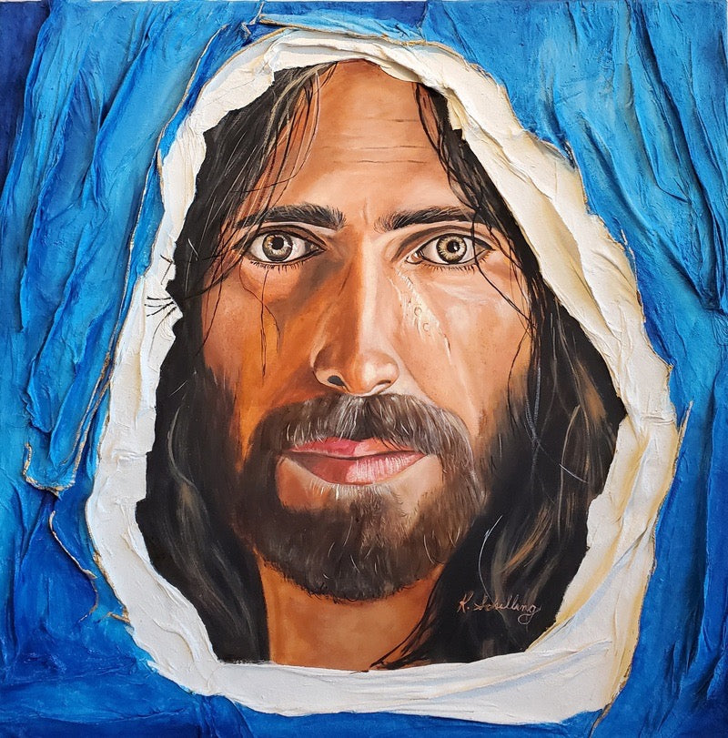 Through the Threads of Grace presents a portrait of Jesus that is both intimate and striking, inviting a direct encounter with a figure emerging from within a textured, dynamic space. At 24 by 24 inches, this oil on canvas combines realism with a dimensional approach, using fiber texture to frame the face as if it is breaking through layers of fabric. This physical depth gives the work a palpable sense of presence, as though the figure steps out from the canvas, drawing the viewer into a moment of quiet intensity.