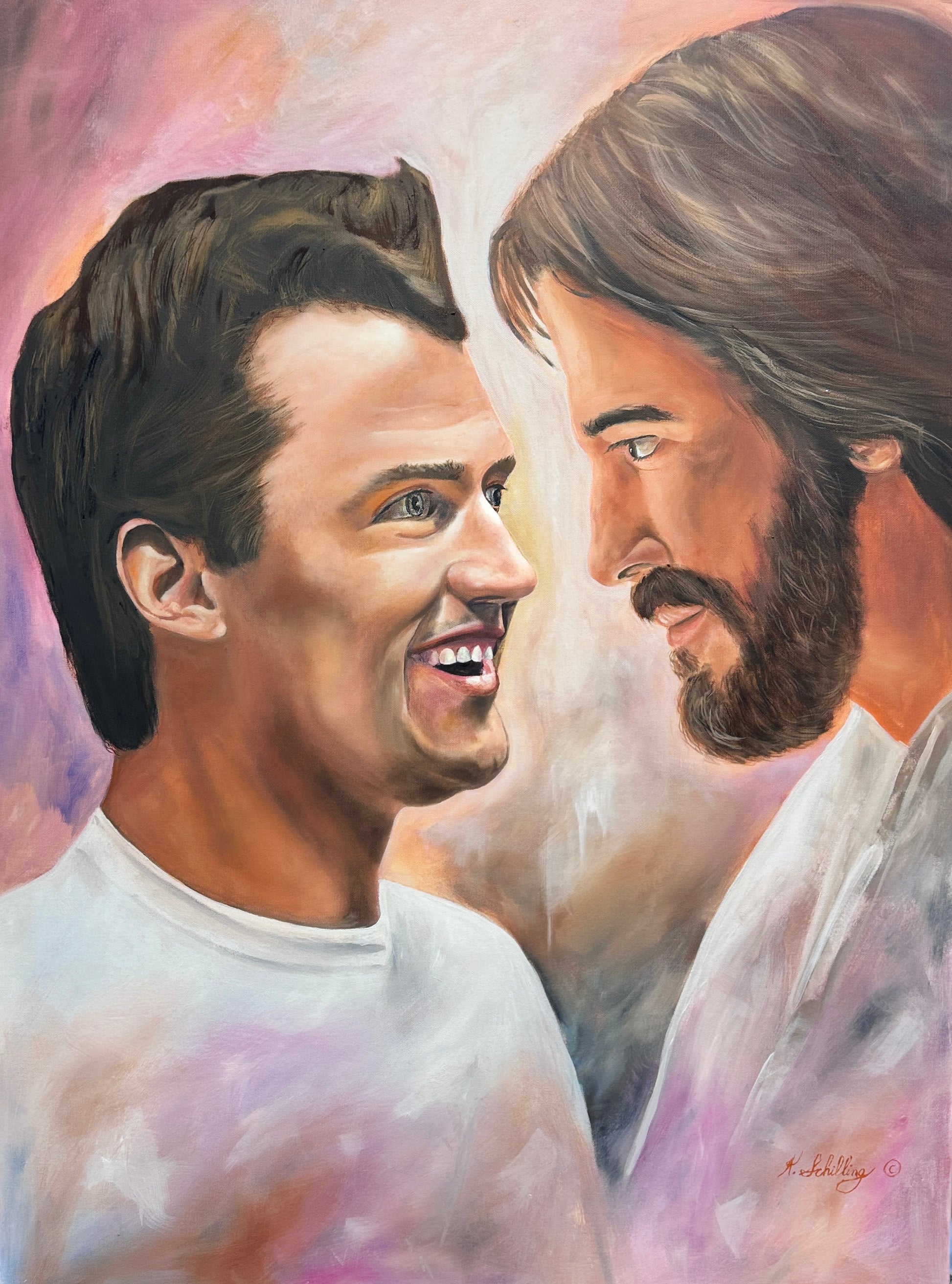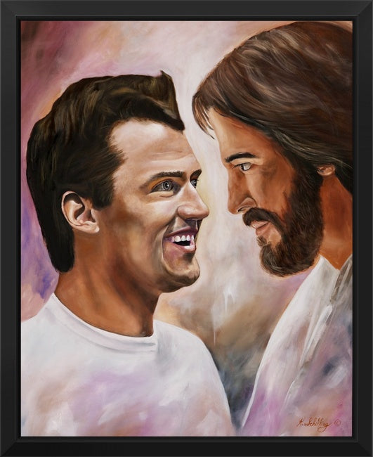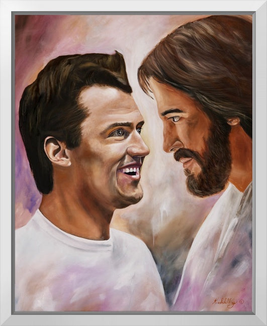 Welcome Home Charlie captures a moment charged with both vulnerability and quiet strength. The painting places Charlie Kirk and Jesus in close proximity, their faces nearly touching—a deliberate choice to draw attention to the unspoken dialogue between them. Charlie’s broad smile and short dark hair contrast with Jesus’s longer brown hair and beard, while his eyes carry an intensity tempered by gentleness. Together, these figures embody a meeting of conviction and compassion, openness and grace.